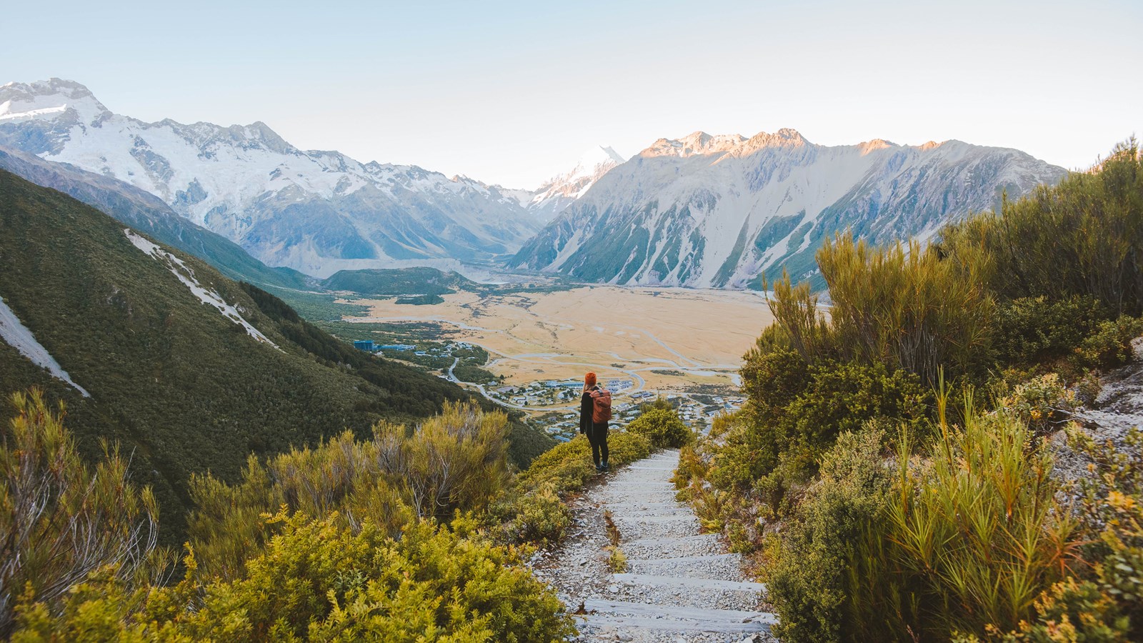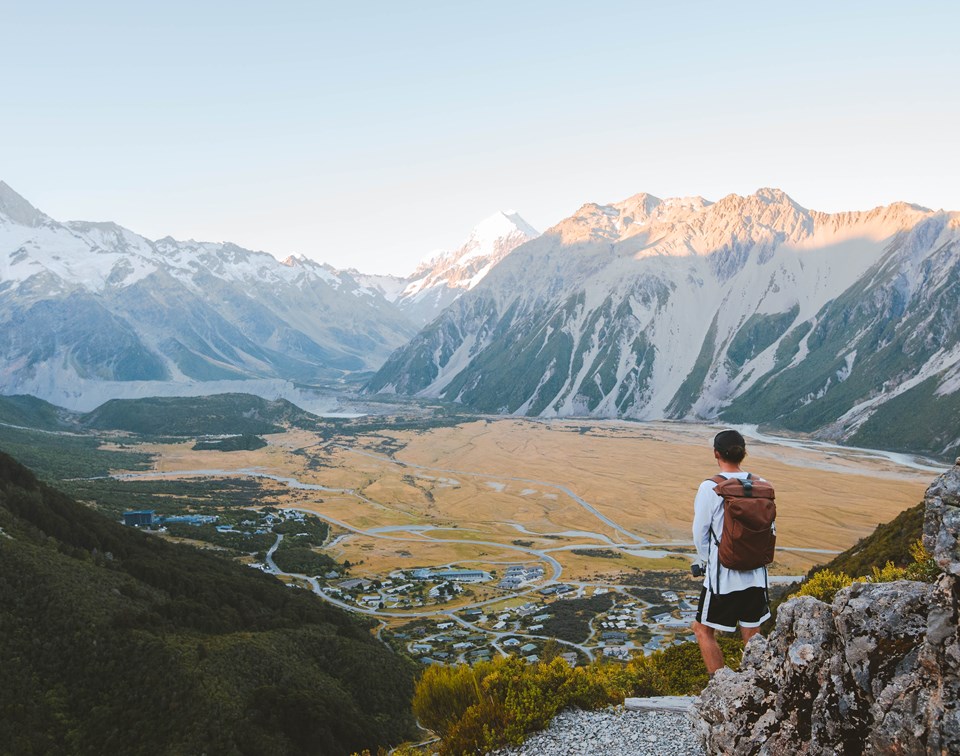 - Views over Aoraki/Mount Cook Village, the Hooker Valley and Aoraki/Mount Cook